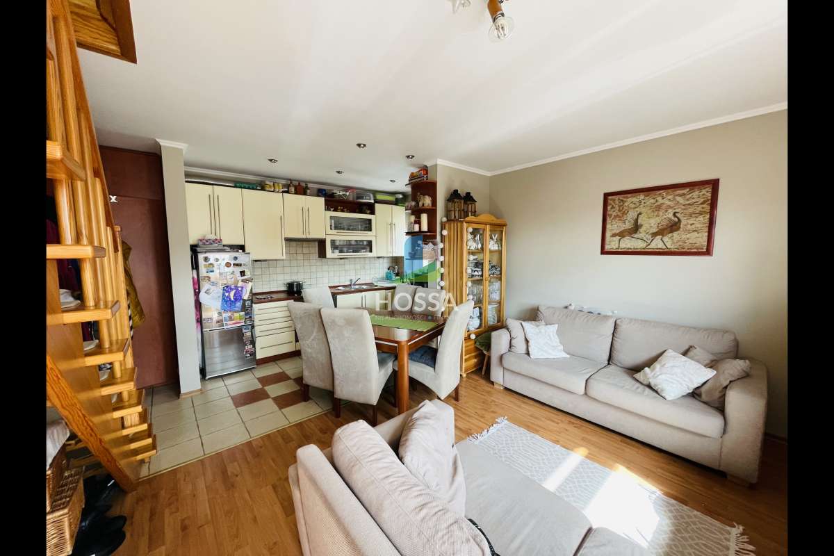 pierwszy poziom - salon, otwarta kuchnia, pokój, łazienka, przedpokój.